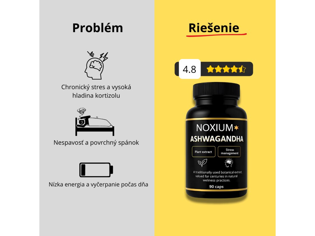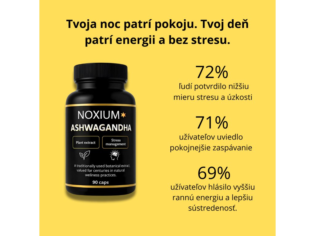 Noxium Ashwagandha prináša prémiový extrakt z koreňa Withania somnifera, jedného z najznámejších adaptogénov. Klinické štúdie ukazujú, že pravidelné užívanie pomáha znižovať hladinu kortizolu, upokojuje nervový systém a podporuje kvalitnejší spánok. Užívatelia zároveň hlásia vyššiu rannú energiu, lepšiu koncentráciu a odolnosť voči stresu.