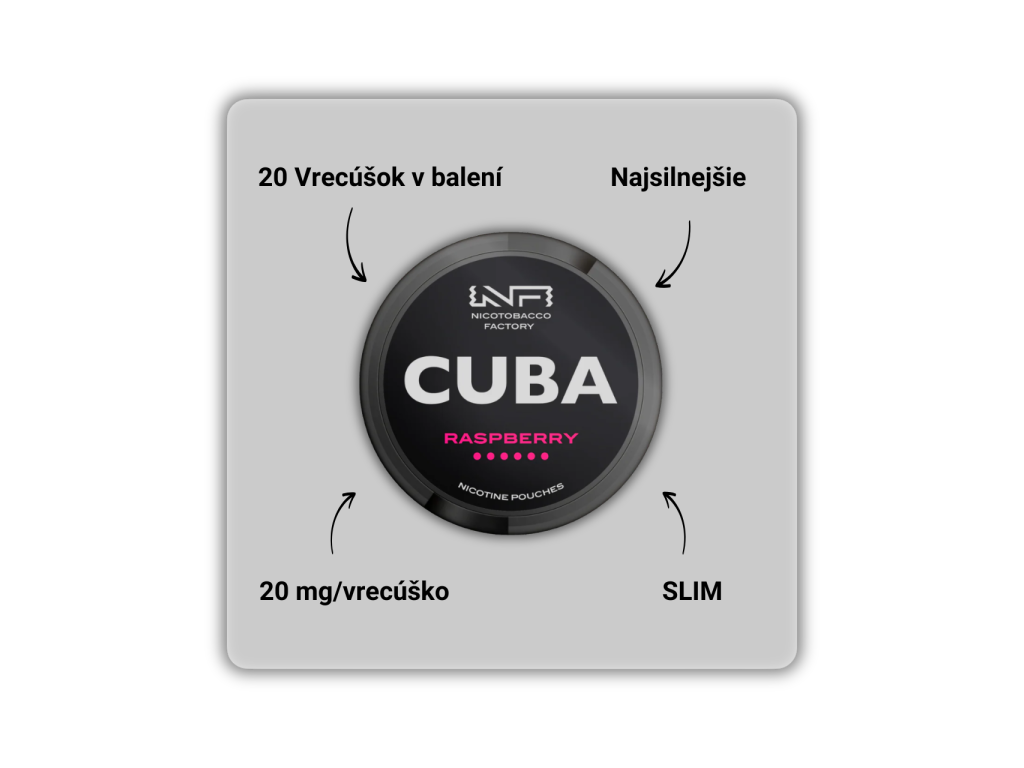 Nikotínové vrecúška CUBA Black Raspberry s výraznou malinovou chuťou a sladkým ovocným profilom. Black edícia je intenzívna a určená pre skúsených užívateľov!