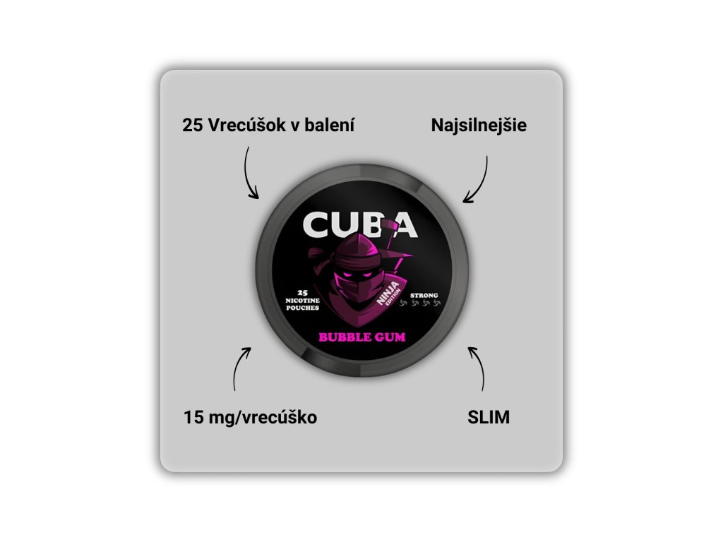 CUBA Ninja Bubble Gum s príchuťou žuvačky ktorá je veľmi dobre podaná, navyše má vyvážený obsah nikotínu 20 mg/vrecúško.