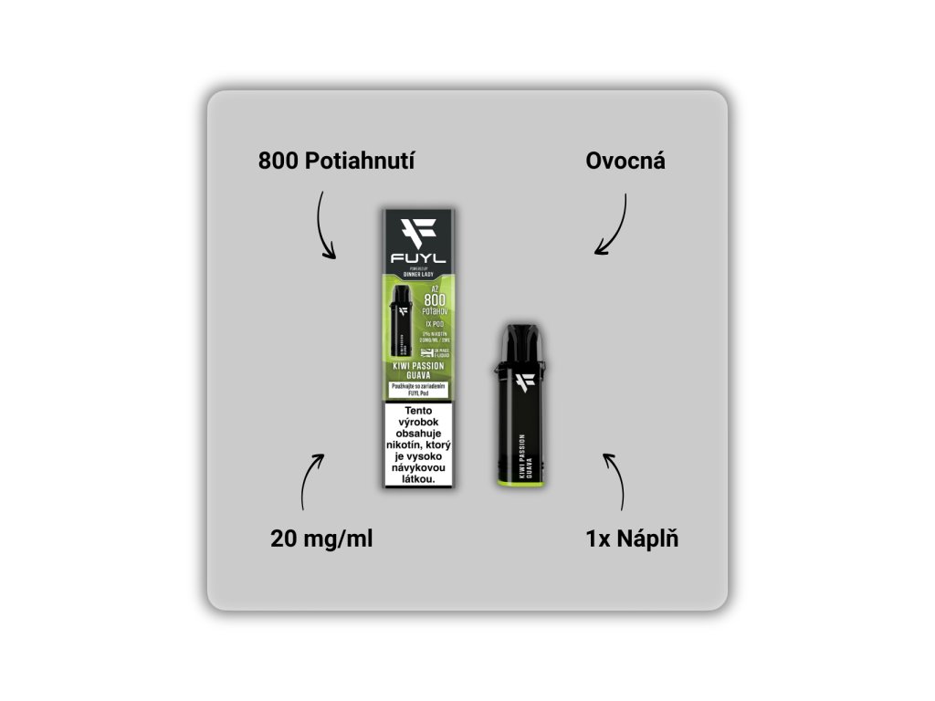 FUYL Pod Kiwi Passion Guava je náhradná cartridge určená pre zariadenie FUYL Kit. Príchuť Kiwi Passion Guava spája sviežosť kivi, exotickú marakuju a sladkú guavu do dokonale tropickej kombinácie, ktorá osvieži pri každom potiahnutí.