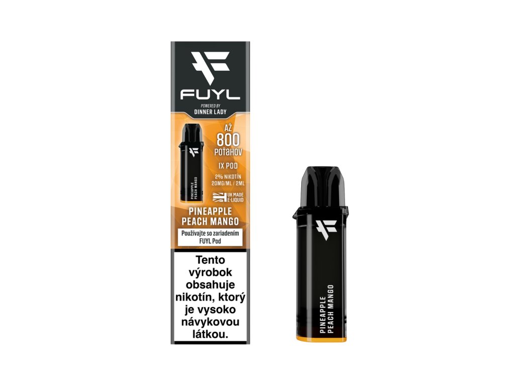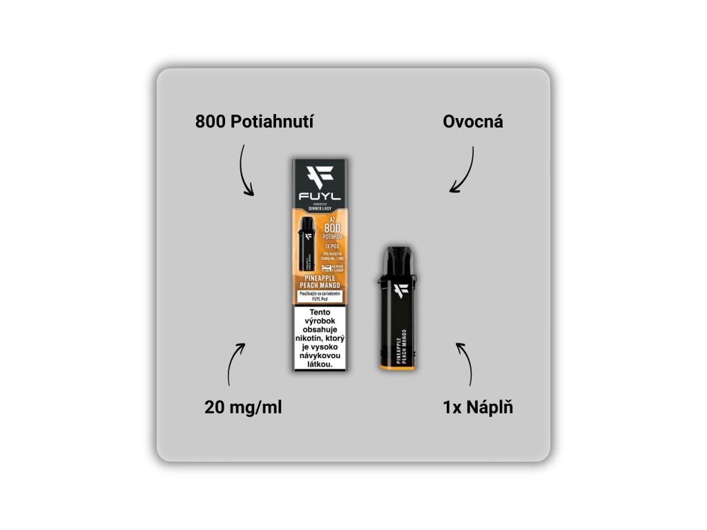 FUYL Pod Pineapple Peach Mango je náhradná cartridge určená pre zariadenie FUYL Kit. Príchuť Pineapple Peach Mango spája sviežosť ananásu, sladkosť broskyne a tropickú chuť manga do dokonale ovocnej kombinácie, ktorá osvieži pri každom potiahnutí.