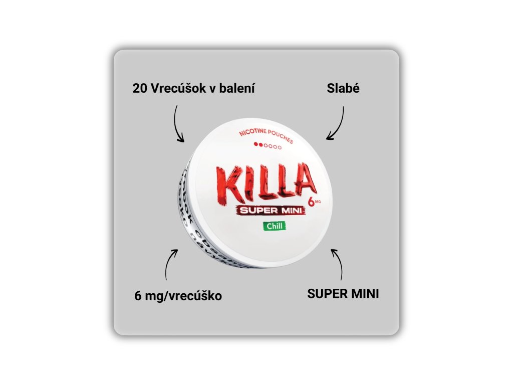 KILLA Super Mini Chill je novinka v Super Mini formáte s tabakovou príchuťou. Menšie vrecúška sú nenápadné pod perou a upravený profil zmesi je navrhnutý pre výraznú a čistú chuť počas celej dávky. V balení nájdeš 20 vrecúšok.