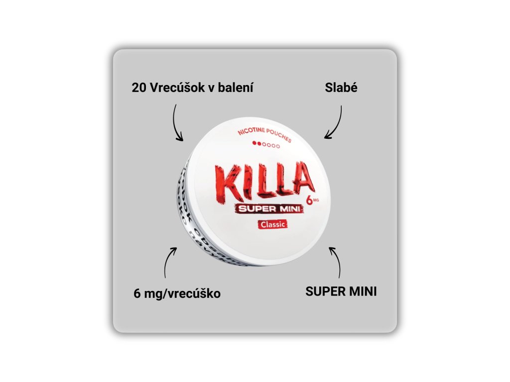 KILLA Super Mini Classic je novinka v Super Mini formáte s klasickou tabakovou príchuťou. Menšie vrecúška sú nenápadné pod perou a upravený profil zmesi je navrhnutý pre výraznú a čistú chuť počas celej dávky. V balení nájdeš 20 vrecúšok.