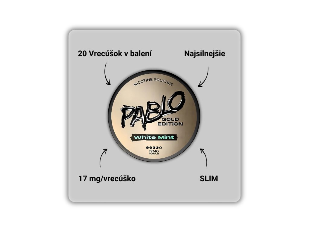 Pablo Gold Edition White Mint prináša silný nával nikotínu s jemnou mentolovou príchuťou a osviežujúcim efektom. Slim vrecká bez tabaku zaručujú diskrétne a čisté použitie bez zápachu a škvŕn.